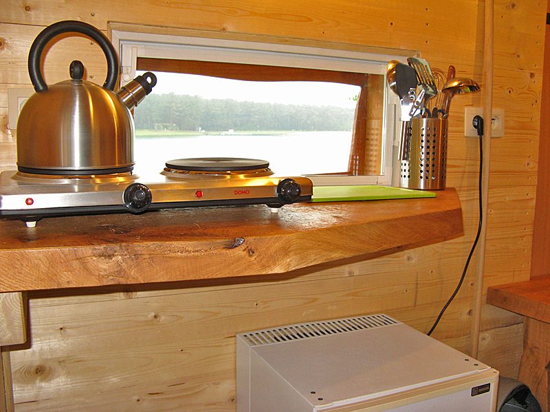 Het keukenblok bij het eethoekje is uitgerust met een kookvuur, een koelkast en een koffiezet. Kookmateriaal vind je op de planken.