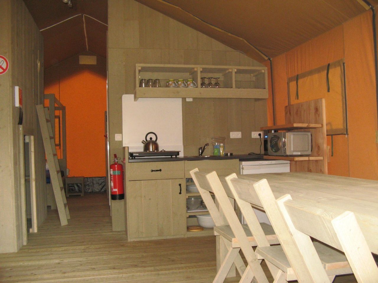 De safaritent is ingericht voor 6 personen. Het keukenblok is uitgerust met een kookvuur, koelkast en microgolfoven. In een apart compartiment heb je een douche, een WC en een wastafel. Kamperen in alle comfort.